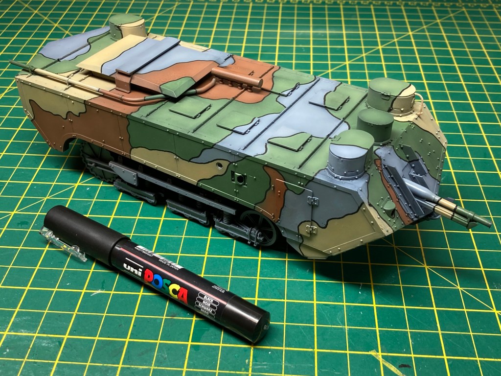 Here’s me trying to figure out how to get tight black lines between the different patches of colour on my St.Chamnond. Uni Posca paint pens are brilliant for this. Water based, errors can be removed with a wet cotton bud, then fixed with a coat of varnish. Follow the tab link to see the results.